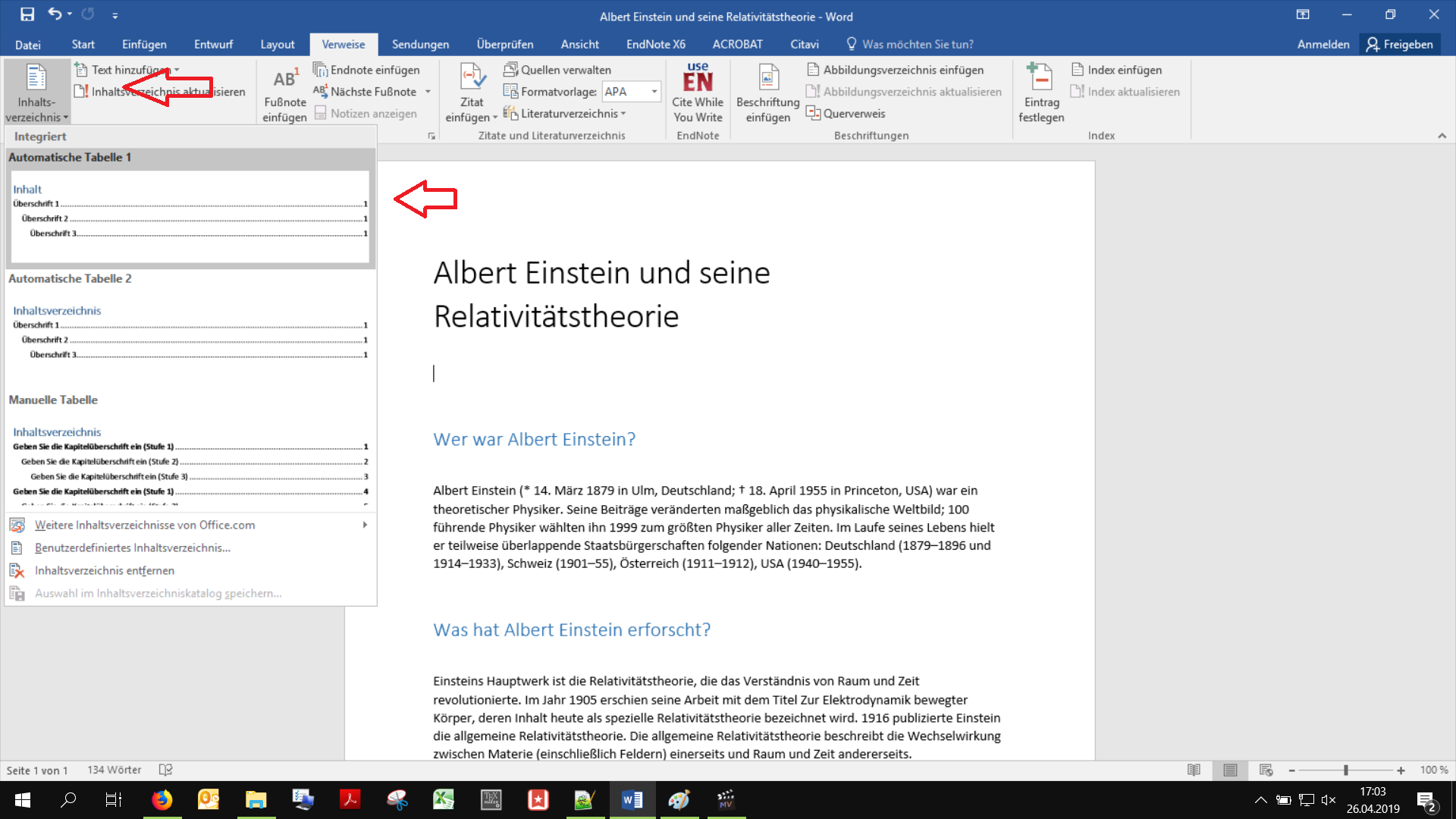 Da wir zuvor bereits die Formatvorlagen für Überschriften verwendet haben ist das Erstellen eines Inhaltsverzeichnisses einfach, denn es kann automatisch erzeugt werden. Im Menü kann unter "Verweise" ganz links der Punkt Inhaltsverzeichnis gefunden werden.