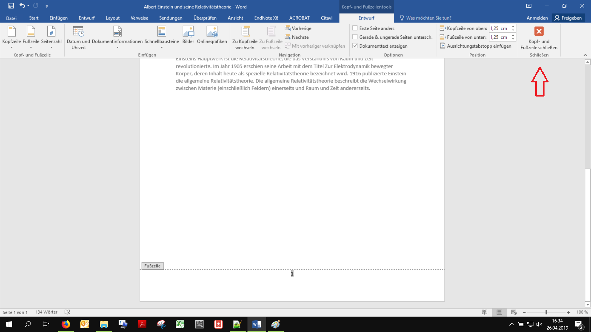 Es öffnet sich die Fußzeile. An dieser Stelle soll nichts weiter in der Fußzeile stehen als die Seitenzahl. Deswegen können wir die Fußzeile wieder schließen.