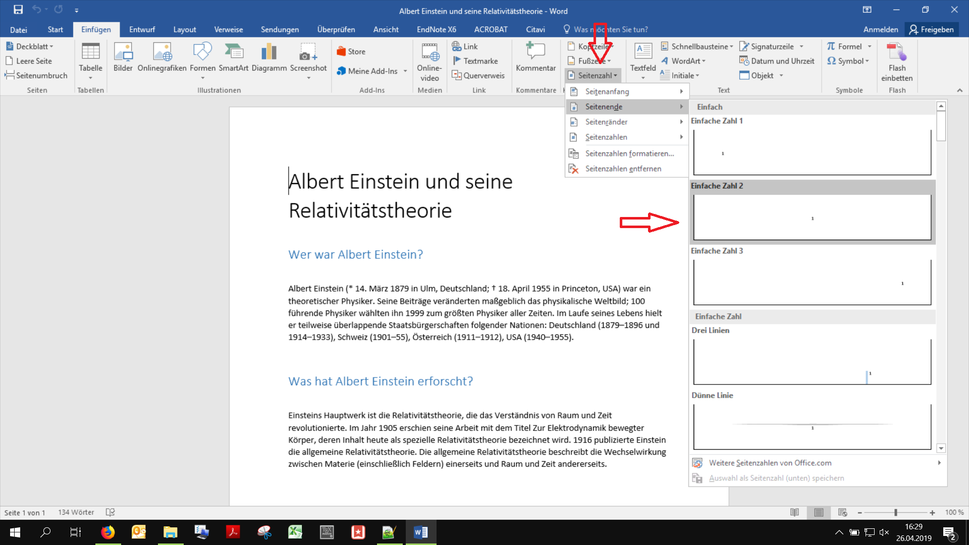 Bei einem Text über mehrere Seiten ist es wichtig an Seitenzahlen zu denken. Für wissenschaftliche Arbeiten braucht ihr keine besonders kunstvollen (auch wenn Word diese zu bieten hätte) Varianten, eine einfache Zahl genügt. Klickt auf Einfügen und dann Seitenzahl. Wählt dann eine Variante, z.B. einfache Zahl 2.